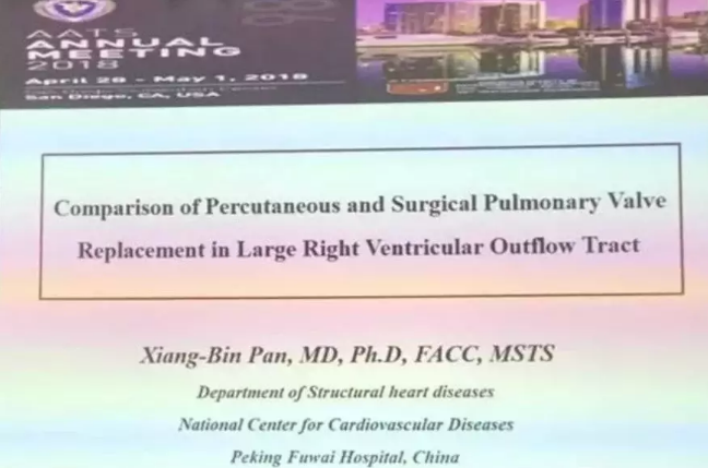 我院总院长助理、中国医学科学院阜外医院潘湘斌教授受大会邀请,于当地时间5月1日进行了题为“经导管肺动脉瓣膜置换和外科传统手术肺动脉瓣膜置换在治疗大右室流出道重建术后肺动脉返流中的比较”的演讲。介绍了阜外医院应用VenusP-Valve进行的经导管肺动脉瓣膜置换,是一种安全有效,微创的手术方式。从阜外医院中期随访数据中,可以很好的证明在治疗大右室流出道重建术后肺动脉返流中,VenusP-Valve可以按照患者的需要,植入较大直径的瓣膜,具有良好的远期效果。