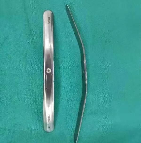 专家们先将特制的矫形钢板按照胸廓形状塑形为弓形。在漏斗胸最低点切开皮肤约3cm。切除剑突后,紧贴胸骨在胸骨后游离隧道,严密止血。在胸壁胸骨两侧做皮下隧道至侧胸壁,将矫形器经胸骨前两侧皮下隧道置入,并进行固定。经检查,矫形满意。