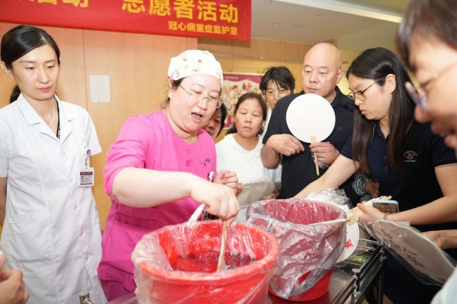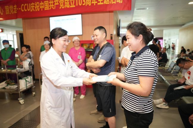 在庆祝建党103 周年之际,2024年7月1日,心血管内科第四党支部(阜外华中心血管病医院心脏重症医学科)携手医院党委办公室、医疗发展部,以党建引领心脏重症为核心,在CCU家属等待区展开了一场充满温情与关爱的主题党日活动。医院党委办公室主任郑丽、副主任薛焱,医疗发展部副主任马昕,心脏重症医学科科主任张静、副主任郭素萍、护士长马凌燕、苏梅,叶发民主任医师等人参与了本次活动。