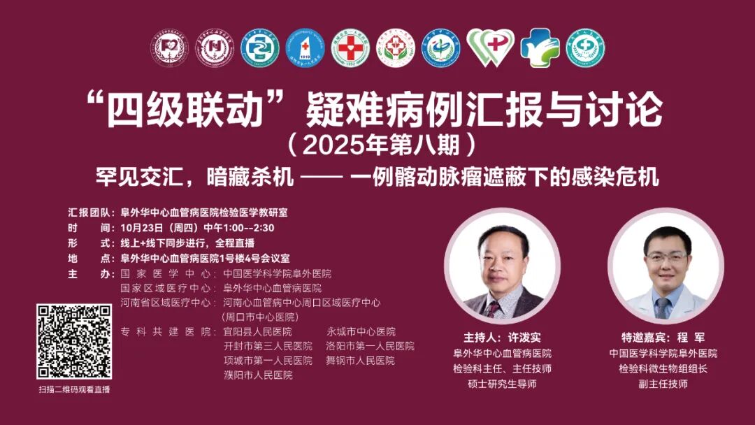 10月23日,阜外华中心血管病医院第八期“四级联动”疑难病例汇报与讨论,以“罕见交汇,暗藏杀机——一例髂动脉瘤遮蔽下的感染危机”为题,通过线上线下同步直播,共探复杂病例诊疗关键路径,为心血管领域疑难病症诊治注入前沿智慧。