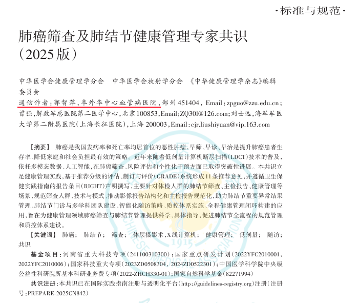 近日,权威期刊《中华健康管理学杂志》刊发《肺癌筛查及肺结节健康管理专家共识(2025版)》(以下简称 “共识”)。