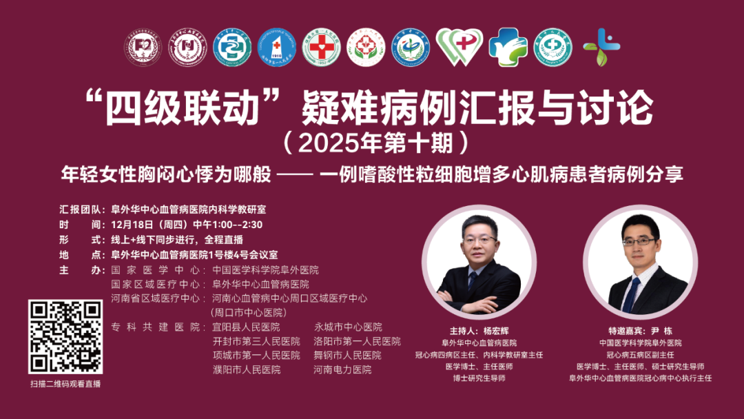 12月18日,“四级联动”疑难病例汇报与讨论第十期开启,本次活动以“年轻女性胸闷心悸为哪般”为题,由阜外华中心血管病医院内科学教研室团队带来一例典型嗜酸性粒细胞增多心肌病患者的诊疗全纪实,通过线上线下同步直播的形式,搭建跨区域诊疗交流桥梁。