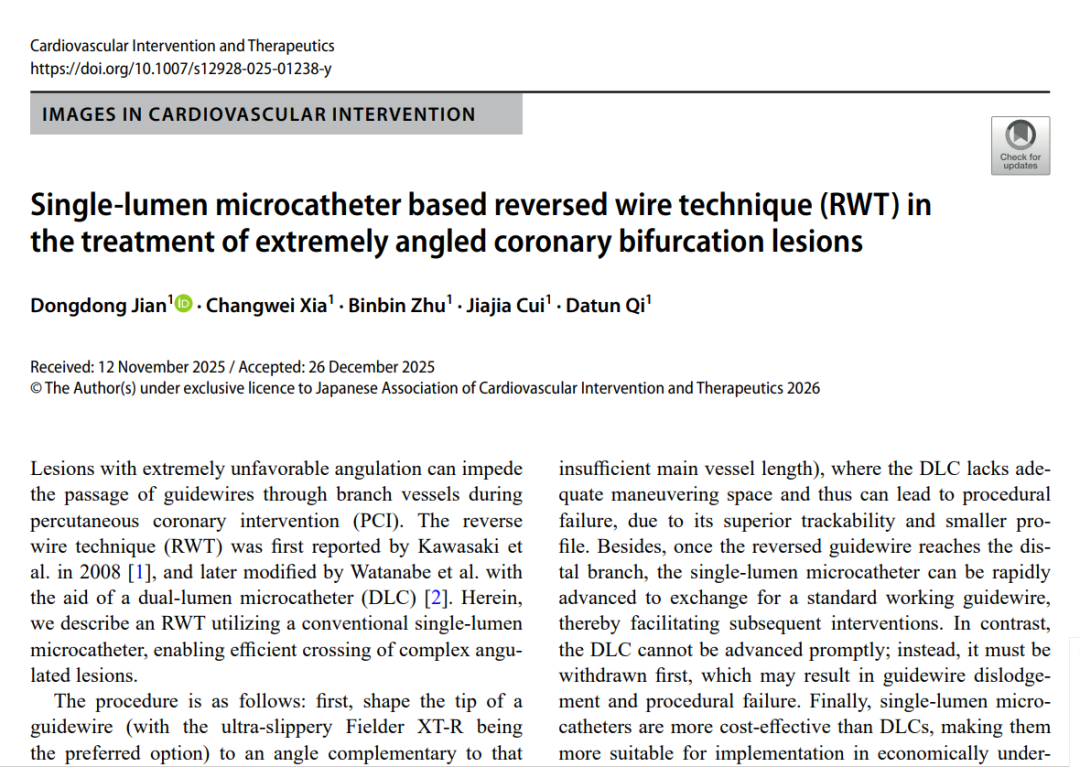 近日,日本介入心脏病学会官方期刊《心血管介入与治疗杂志》,刊登了我院专家团队的一项重要研究成果。这项名为“单腔微导管反折导丝技术”的创新方法,为冠心病治疗中棘手的刁钻分叉病变提供了全新解决方案,也是国际上首次正式介绍该技术,彰显了我院在心血管介入领域的国际影响力。