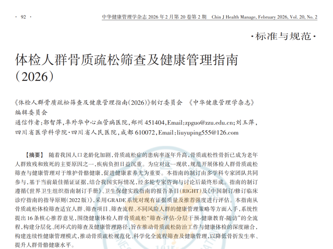 近日,由阜外华中心血管病医院郭智萍教授担任专家组组长和通信作者,汇聚了骨科、内分泌科、中医科、老年医学科、放射科、健康管理学科、营养科等多领域顶尖专家智慧编制的《体检人群骨质疏松筛查及健康管理指南(2026)》正式发布。
