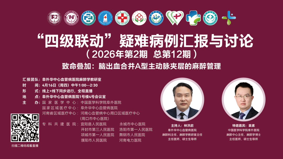 本次活动特邀中国医学科学院阜外医院麻醉中心主任、主任医师袁素教授线上指导,阜外华中心血管病医院麻醉与围术期医学科主任林洪启、大血管外科主任张志东、体外循环与体外生命支持科主任李建朝、神经疾病科副主任唐东方、麻醉与围术期医学科副主任郎志斌、放射科副主任张继良、血管疾病重症监护室副主任陈会娟等多学科专家现场点评,各地医护人员云端参会,解锁双重危重症的麻醉管理与多学科诊疗团队(MDT)实战密码。